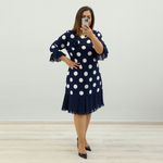 • Détails : Gros pois, fleur appliquée à l’épaule, ourlet plissé